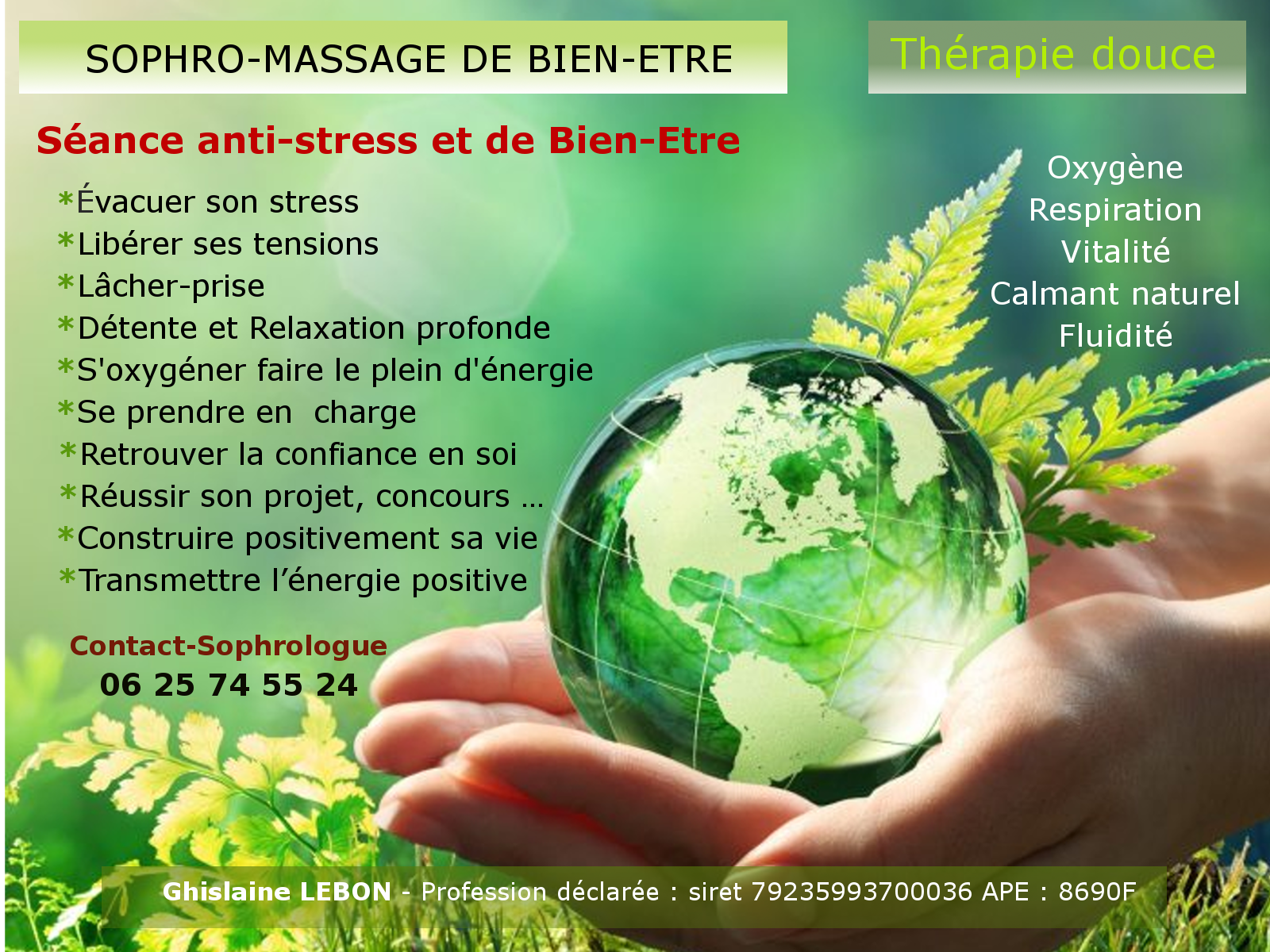 Le SOPHRO-MASSAGE de Bien-Être comprend : massage de la tête, nuque, cervicales, épaules, trapèzes, omoplates, bras et mains, dos, lombaires, pieds. Huiles essentielles Bio utilisées : gaulthérie et lavande.