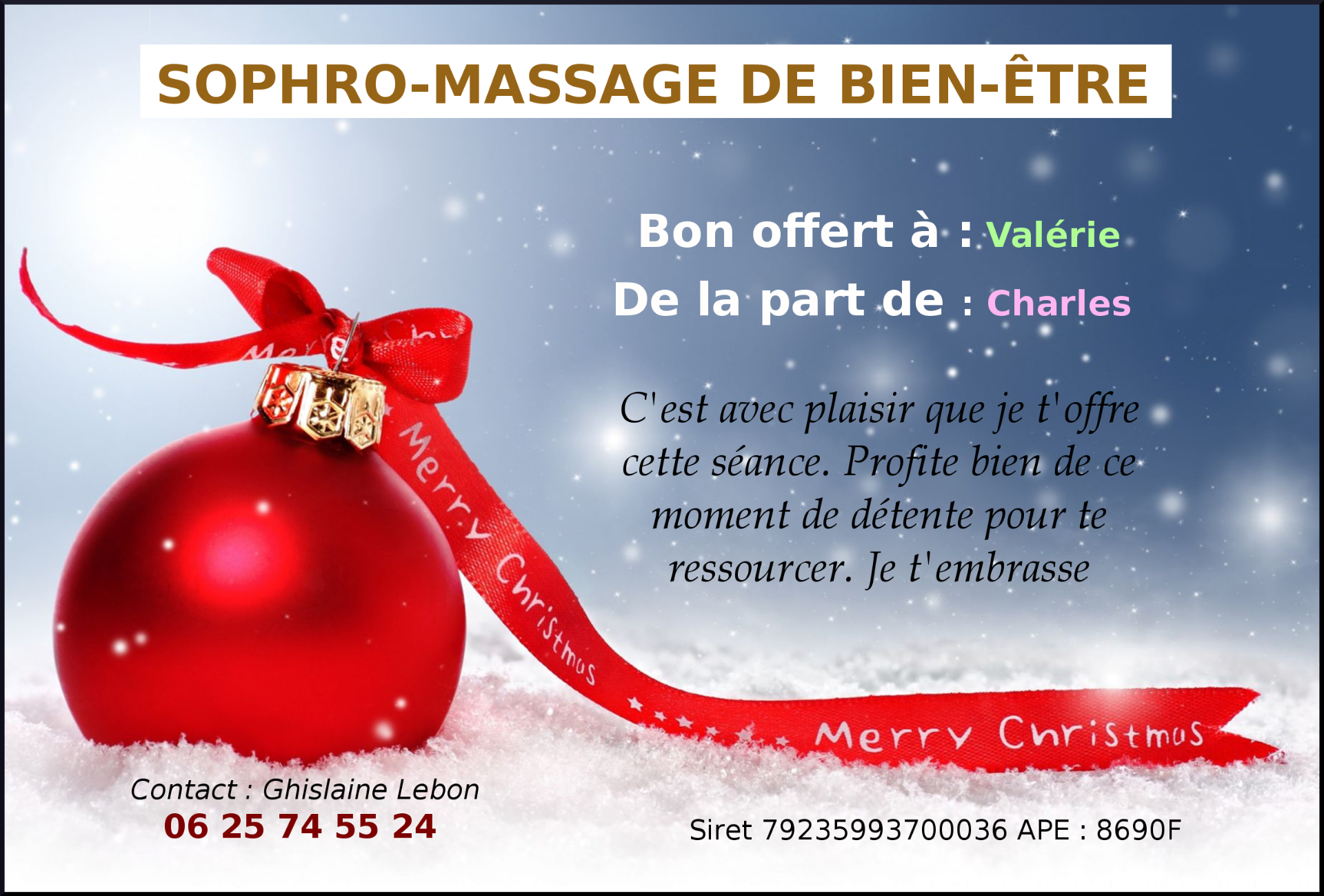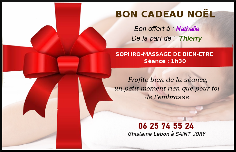 Offrez un bon cadeau, pour un moment de pure détente pour les Fêtes ! Et si cette année, vous offriez bien plus qu'un cadeau… une parenthèse de bien-être ?Une séance de sophro-massage ultra-relaxante, conçue pour apaiser le corps et l'esprit, idéale pour évacuer le stress et recharger les batteries. Un vrai bonheur à partager avec vos proches pour des fêtes sereines et ressourçantes.